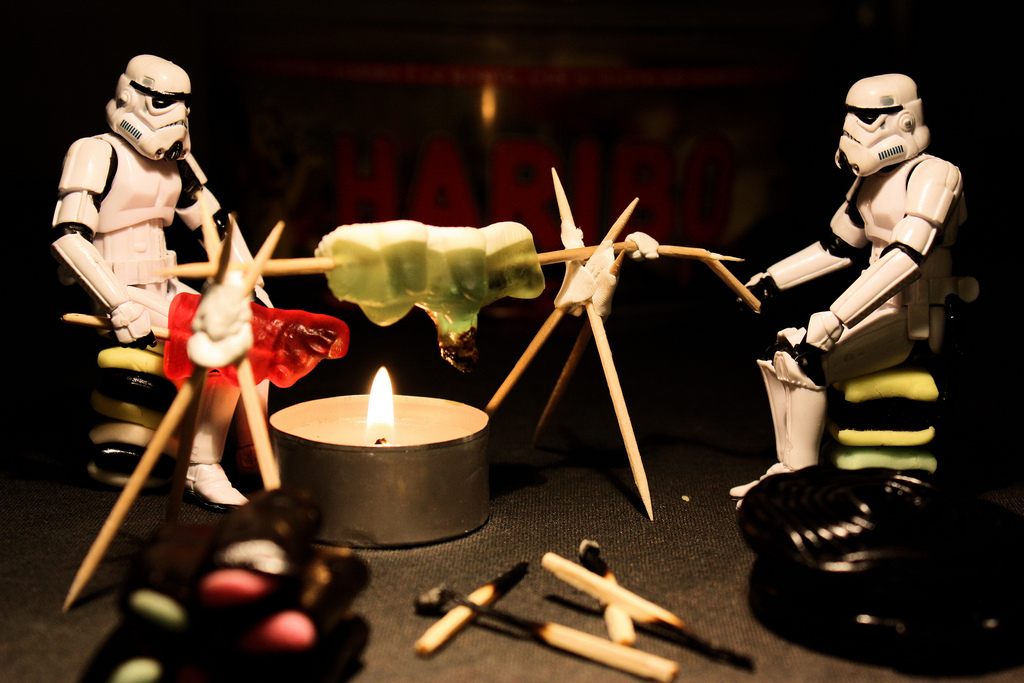 Quant à l’inspiration, pour la série Stormtroopers 365, il y a différentes sortes d’idées. Celles qui mettent les Stormtroopers face à des objets de notre monde à nous ; dans ce cas l’inspiration vient simplement des objets eux-mêmes : en les voyant, je me dis “qu’est-ce qui pourrait se passer d’amusant si des Stormtroopers de dix centimètres rencontraient ce machin ?”. D’autres photos jouent plutôt sur les références à Star Wars, comme la série de la recherche des droïdes que nous recherchons. Il y a également des références à d’autres films, comme Retour vers le futur, Gremlins, etc. Finalement, l’inspiration vient donc d’un peu tout ça : des ustensiles de cuisine et des références de pop-culture légèrement orientées 80’s.