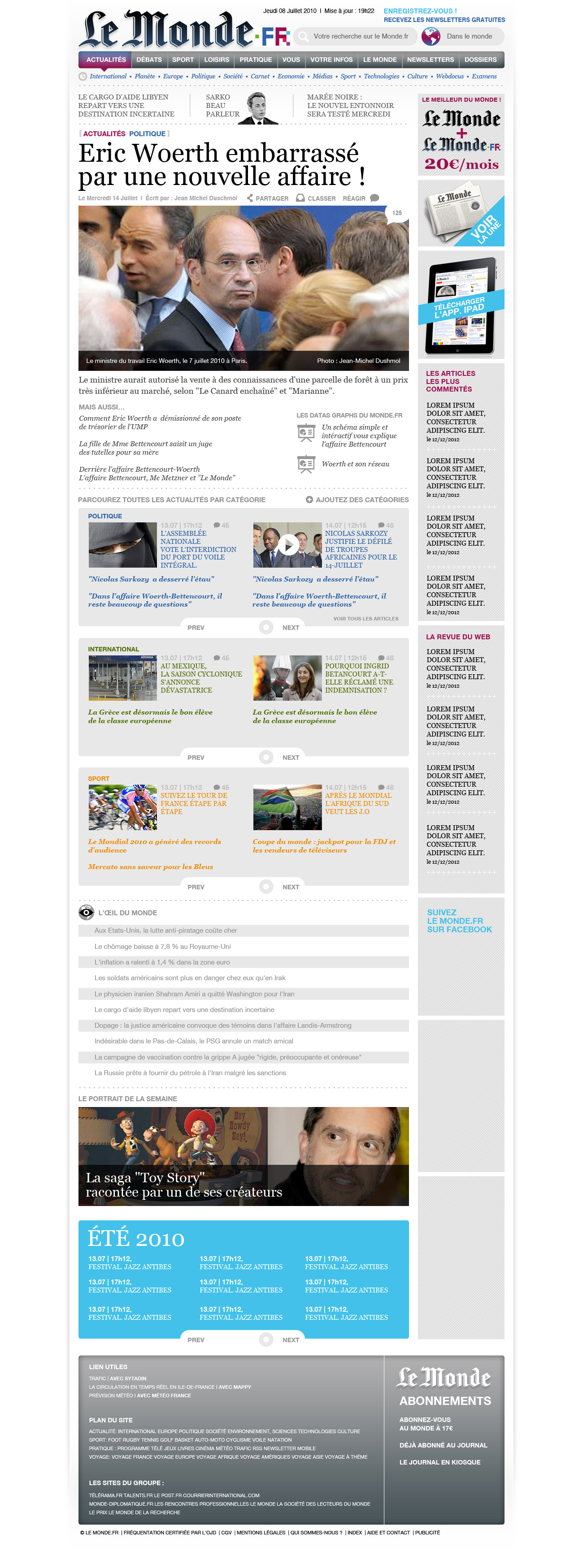 « Redesigner lemonde.fr » sera donc un des chantiers les plus intéressants des prochains mois. Mais ne renversons pas le calendrier. Pour l’instant la maquette n’est pas encore le défi numéro 1. Le défi c’est donner les moyens à la rédaction du site de pouvoir faire du journalisme de qualité. La maquette sera alors naturelle.”