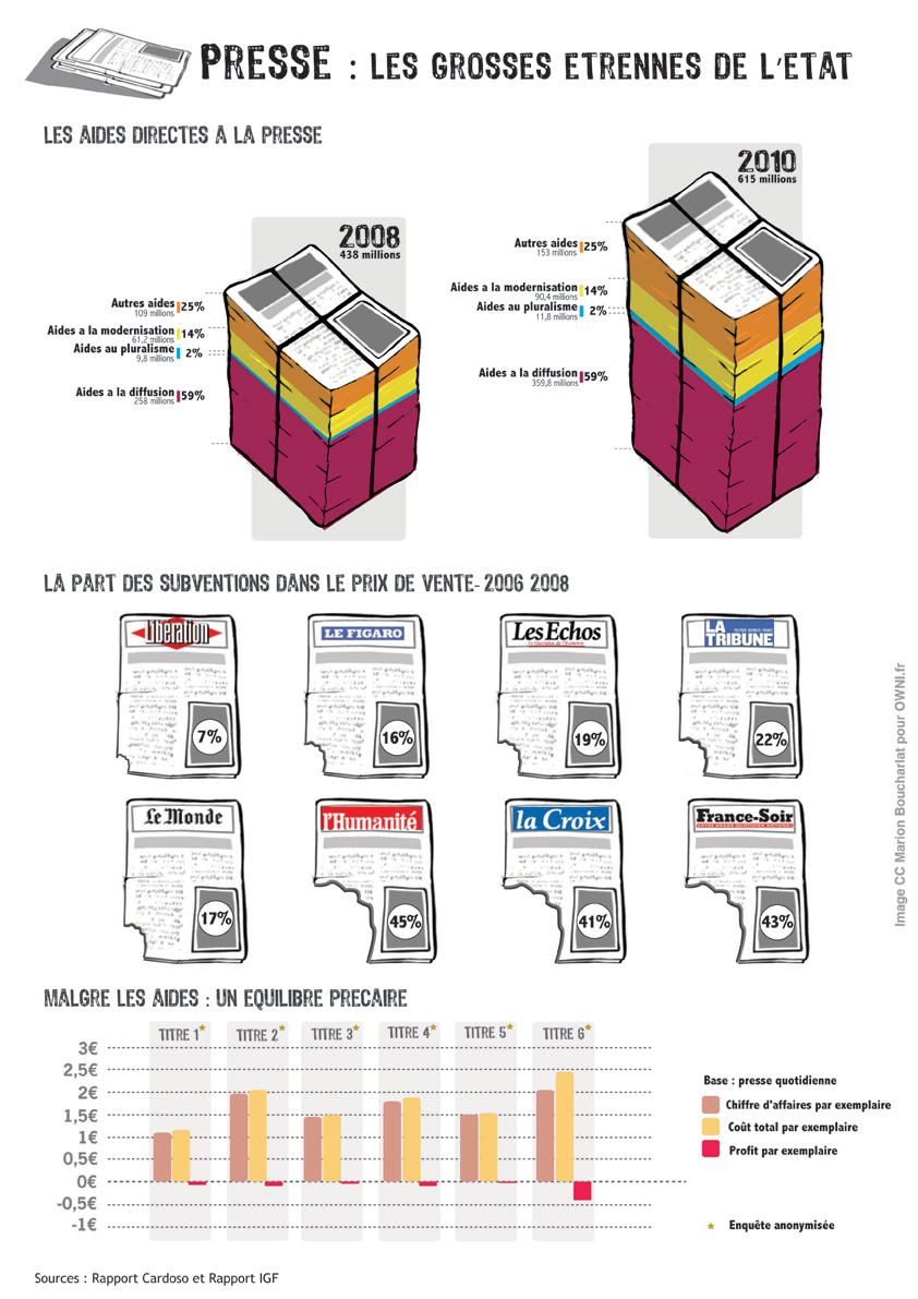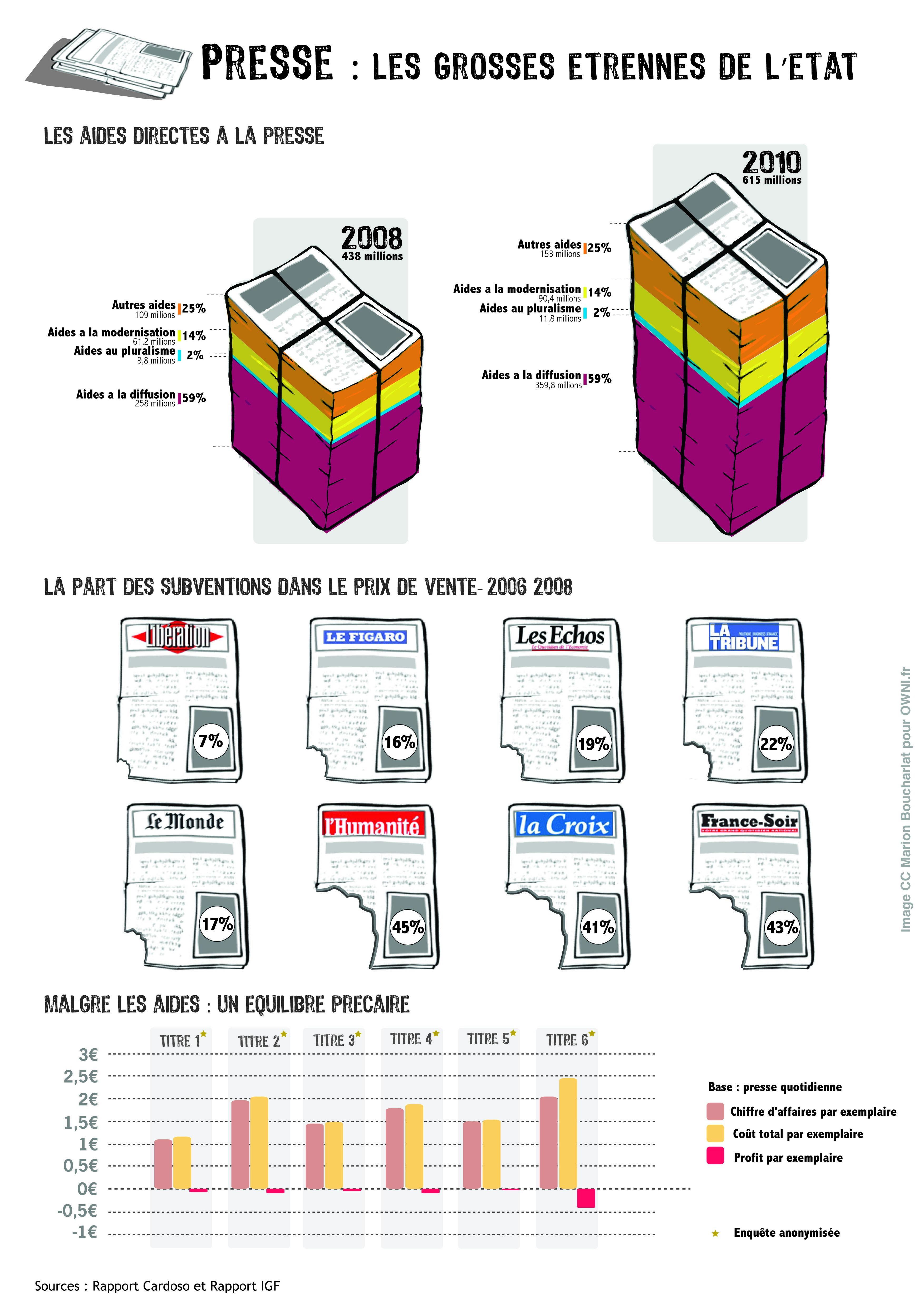 Retrouvez, dans cette infographie, la part des subventions dans le prix de vente des principaux quotidiens français et la comparaison de la répartition des aides entre 2008 et 2010.