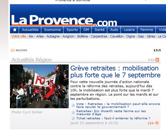 [MàJ 14h14] L’Elysée s’est félicité de la baisse du nombre de manifestants. Il est intéressant de constater que cette réalité est plus contrastée sur le terrain. Alors que dans plusieurs villes de province, la mobilisation est en baisse, ce constat n’est pas partagé partout. Ainsi La Provence relève en page d’accueil une manifestation plus importante que celle du 7 septembre.