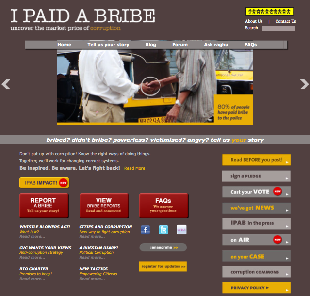 En Inde, la corruption est tellement importante qu'elle mène à de sérieuses injustices. Le site "I paid a bribe" encourage les indiens à raconter leurs histoires de corruption et mettre au jour les prix du “marché” de la corruption.