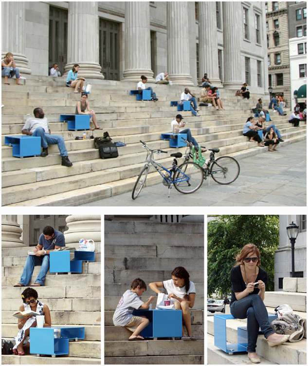 Témoin de cette évolution, de nombreux projets d’architecture/urbanisme proposent ni plus ni moins d’installer de « faux » escaliers dans la ville (à découvrir dans le billet). Poussant la réflexion, le designer Mark A. Reigelman II propose même “d’officialiser” la mutation possible de chaque escalier urbain en lieu de pause, à l’aide d’un structure sommaire à utiliser comme chaise, table, accoudoir, etc. (via Escales, escalades et poudre d’escampette, chez Chronos). Idéal pour une partie de tarot entre deux cours ! ^^