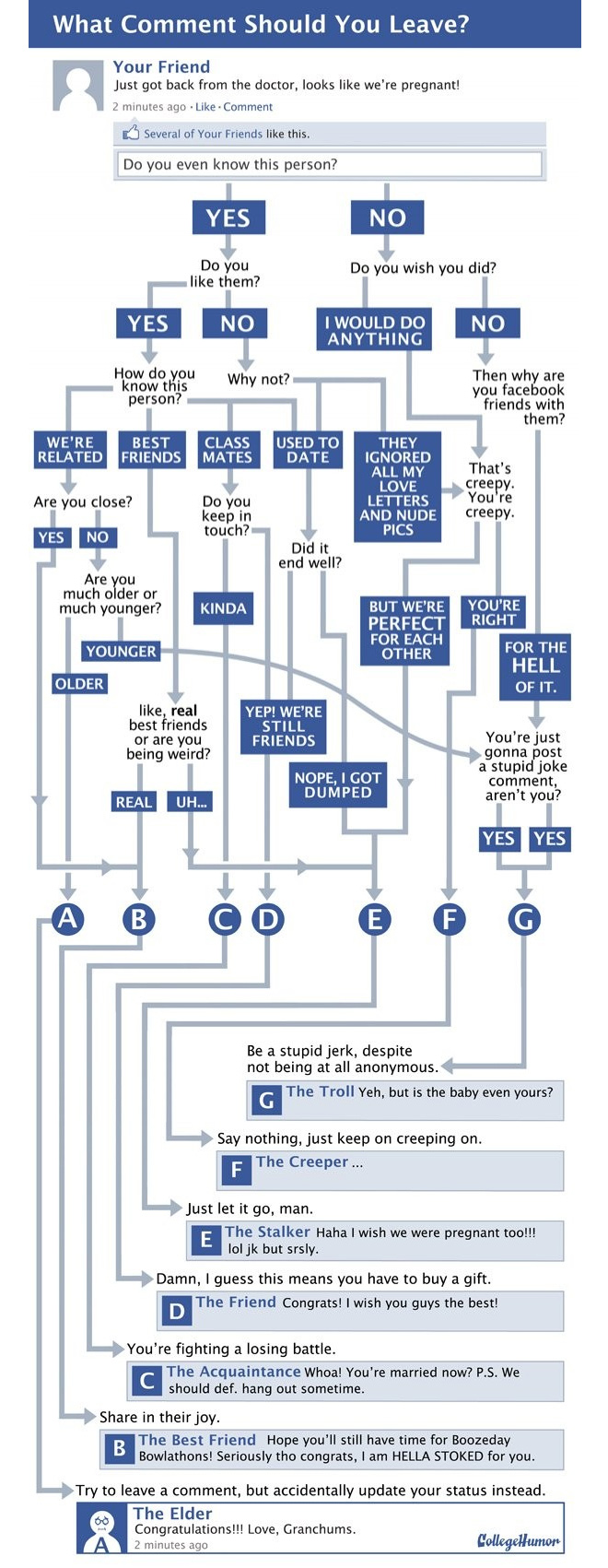 Toujours cette semaine, on aura bien rigolé devant ce schéma qui nous fait réfléchir sur les commentaires dans Facebook. Avec Facebook, les conversations sont parfois intimes, les nouvelles sont partagées simultanément et instantanément avec un cercle énorme d’amis, dont la plupart sont parfois même des inconnus. Grâce à ce schéma, vous saurez donc maintenant comment répondre à un nouveau “statut” publié sur Facebook par l”un de vos amis. En théorie, vous ne devriez plus vous tromper ;-)