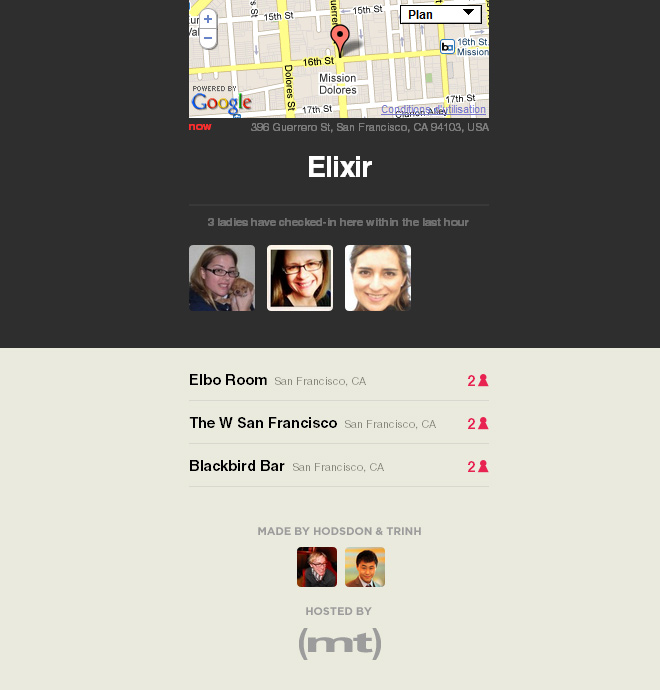 Dans un tout autre style, je vous présente “Wheretheladies.at”, une application web qui regroupe les “checkins” Foursquare envoyés par des femmes. Cette application iPhone est en réalité une énorme boussole avec une flèche qui pointe dans la direction de ces dames. Très fin non ? L’application vous permet ainsi de voir dans les localités voisines, le nombre de “ladies” qui ont publié leur position sur Foursquare. Actuellement l’application fonctionne uniquement à San Francisco, mais l’équipe travaille d’arracher pied pour la faire fonctionner dans d’autres villes… Arf !