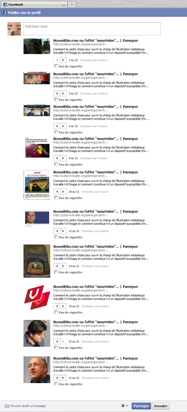 En effet à chaque lien partagé sur son mur, Facebook propose d’associer une image sous forme d’une petite vignette. Or au moment de partager l’article, l’application Facebook me propose de choisir entre 22 vignettes différentes. Et si plusieurs des images proposées proviennent de l’article en question, toutes n’ont pas forcément de lien avec ce dernier. Ainsi je retrouve des images illustrant d’autres articles, des portraits, le logo de la plateforme Culture Visuelle ou encore l’image choisie par Olivier en bannière de son site. Le tout sans aucune légende qui pourrait orienter mon choix.