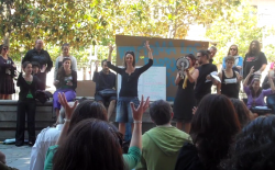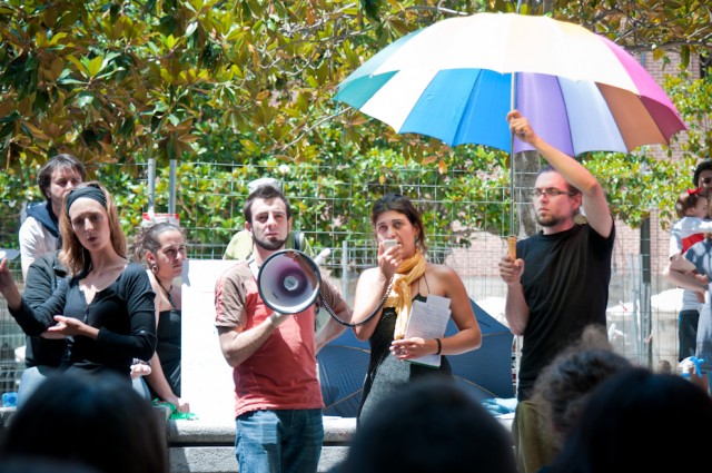 L’assemblée continue avec la lecture d’un résumé des propositions adoptées pendant l’assemblée générale de Sol [acampadasol] réunie la veille, vendredi 3 juin sur la place Sol à Madrid. Une assemblée générale de grande ampleur où étaient convoqués pour la première fois tous les représentants des 54 #acampadas d’Espagne3 et des internationaux #interacampadas. Est notamment évoquée l’épineuse question du campement sur la place : une minorité de personnes souhaitent maintenir en place les infrastructures actuelles. Une majorité souhaite décentraliser le mouvement de la place Sol et diriger toutes les énergies vers les assemblées de quartier, tout en conservant un point d’information.