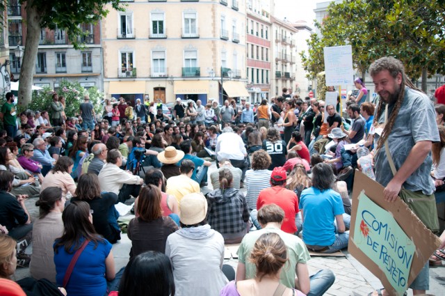 Madrid. Samedi 4 juin, au cÅ“ur de la Latina, l’assemblé de quartier Los Austrias ouvre sa séance à 12 heures sur la place Carros. Un quartier bobo de la capitale où vivent beaucoup de gens du spectacle (scénaristes, comédiens, etc..). Entre 50 et 100 personnes sont réunies sur la petite place, tous âges confondus. La modératrice ouvre la séance avec une présentation de l’assemblée de quartier, de ses fonctions et de ses objectifs : prendre des décisions sur les propositions d’actions concrètes et pour chacune d’entre elles, arriver à un accord unanime [un consenso]. Des équipes d’environ dix personnes animent la séance et à chacune d’entre elle est attribué un poste avec une liste de tâches. Aucune personne ne peut garder ce poste de manière définitive et un système de rotation est mis en place avec tous les citoyens de la place qui sont donc appelés à participer.