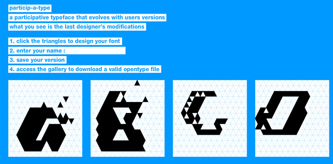 On avance avec le travail d’Élise Gay et de Kévin Donnot, deux étudiants des Beaux-Arts de Rennes qui ont réalisé le site “Particip-a-type”, un site participatif  qui permet de créer, ensemble, une typographie en ligne. Belle idée, utopique et expérimentale s’il en est. Le fonctionnement est simple, chaque nouvel utilisateur est invité à modifier le dessin du caractère créé par l’utilisateur précédent, et le suivant fera ensuite la même chose. L’évolution est donc impressionnante, surtout qu’il est possible de télécharger à chaque fois la police de caractère réalisé au format Opentype pour être utilisée… en vrai !