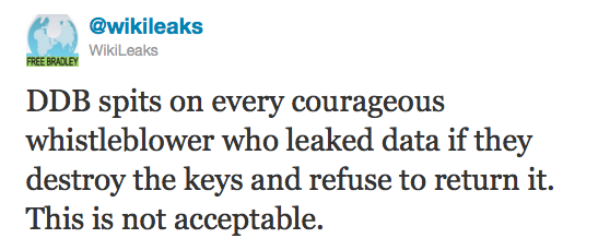 Alors que la rumeur enfle en même temps que les campeurs du CCCamp rentrent chez eux, WikiLeaks décide de faire publiquement pression sur son ancien collaborateur par le truchement de son compte Twitter. “DDB crache sur tous les informateurs courageux qui font fuiter des informations s’il détruit les clés et refuse de les rendre. C’est inacceptable” :