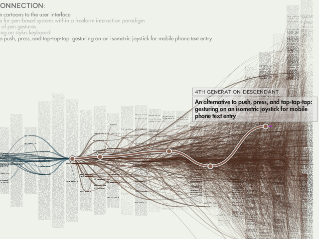 Citeology [en] est un projet extraordinaire coordonné par Justin Matejka au sein du laboratoire de recherche des fameux logiciels de modélisation Autodesk/AutoCAD. Ce projet Citeology permet de visualiser les relations entre des publications selon les citations qu’elles utilisent. Pour l’exercice, plus de 3 500 documents portant sur les interactions humains-ordinateurs et publiés au cours des 30 dernières années ont été passés à la moulinette data pour créer cette application (nécessite le plug-in Java) qui fait ressortir près de 12 000 citations croisées au sein de la collection. Le résultat est tout simplement époustouflant et ouvre la porte à des pistes de visualisations réellement innovantes, notamment dans le domaine émergent de la “big data“.
