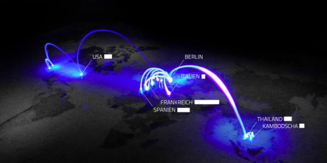 Lichtreise [de] est un projet de Christopher Pietsch s’inscrivant dans le cadre d’un cours interactif au sein de l’Université des Sciences appliquées de Potsdam. Le but : concevoir une visualisation qui affiche (au minimum) sept voyages sélectionnés de la vie de l’étudiant. La conception et le résultat final font l’objet d’une série de très jolies photographies de ce projet très “do it yourself“.