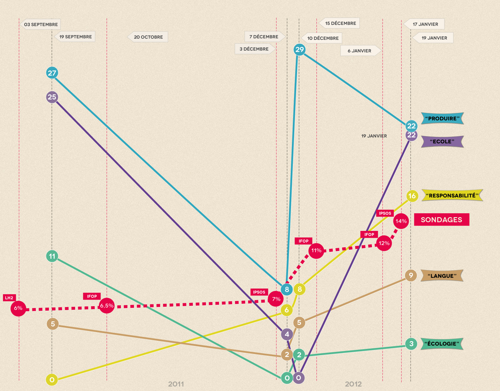 Avec le verbe “résister“, comme refrain de son discours de Dunkerque du 19 janvier dernier, François Bayrou a illustré cette ascension. Il résiste à ceux qui ne le voient pas en troisième homme du premier tour de la présidentielle. Le candidat du made in France talonne à présent Marine Le Pen. OWNI a voulu savoir quels termes de ses discours avaient disparu ou au contraire apparaissaient, corrélé à sa position dans les sondages. Cliquez sur l’image ci-dessous pour prendre connaissance de cette cartographie du lexique Bayrou :