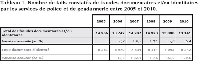 L’ONDRP précise par ailleurs qu’en 2010, 2 670 documents frauduleux français ont été saisis par la Police aux frontières : 1 142 titres de séjour, 216 visas, 651 cartes d’identité, 510 passeports et 151 permis de conduire. Et sur ces 651 cartes d’identité, 133 étaient des contrefaçons, 63 des falsifications, 185 relevaient d’usages frauduleux, 269 avaient été frauduleusement obtenues, et un avait été “volée vierge“.