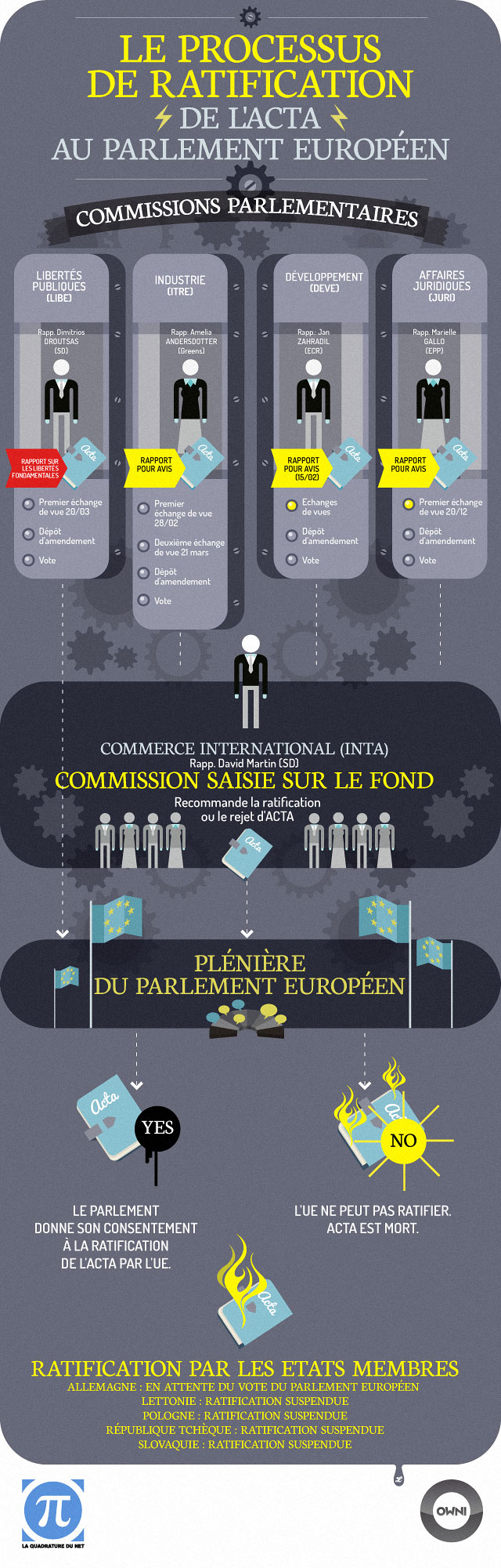 Le vote du Parlement européen sur Acta interviendra entre juin et septembre. D’ici là , un processus complexe est enclenché, fait de multiples rapports, échanges de vues, débats, amendements et votes. Dans lequel de commissions parlementaires sont impliquées. OWNI, en partenariat avec la Quadrature du Net, a essayé d’y voir plus clair.