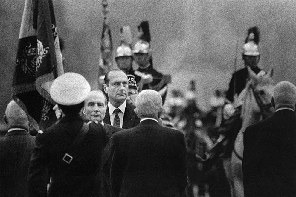 France, Paris. 8 mai 1988. Célébration de l'armistice sous l'Arc de Triomphe et jour du deuxième tour de l'élection présidentielle. François Mitterrand, Président de la République et Jacques Chirac, Premier Ministre. ©Jean-Claude Coutausse