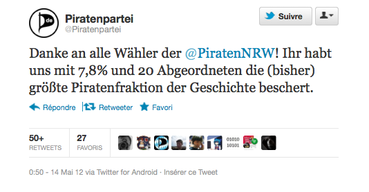 Le bal des pirates avait été ouvert en septembre avec leur entrée fracassante au Parlement de Berlin, suivi de celui de Sarre et du Schleswig-Holstein. À chaque fois le score oscillait autour de 8%. Ils se sont permis à deux reprises de dépasser le FDP, partenaire mal en point de la coalition conservatrice emmenée par la chancelière Angela Merkel. Quant à Die Linke, l’extrême-gauche, elle est en déroute. Ils talonnent les Verts, et un sondage – un peu optimiste – les avaient même placés devant eux le mois dernier.