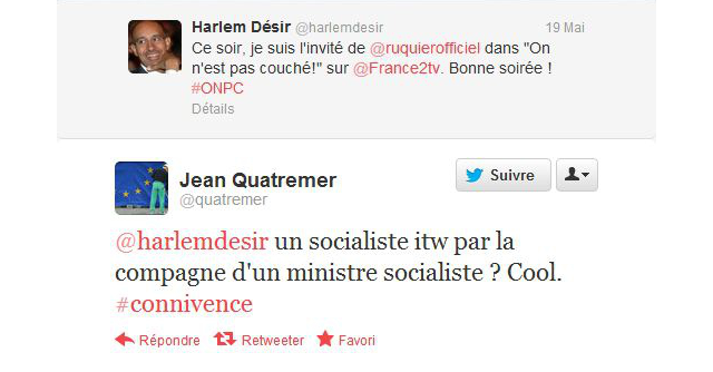 19 mai 2012, Audrey Pulvar interroge Harlem Désir sur le plateau de l’émission de France 2 On n’est pas couché. Le journaliste Jean Quatremer1 lance alors une courte joute verbale sur Twitter :