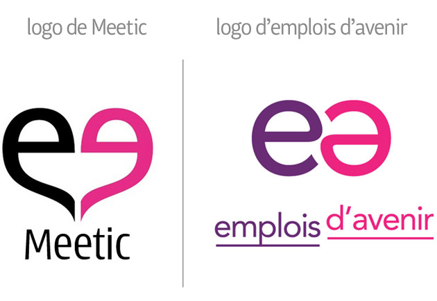 Pour revenir à notre logo, il s’avère assez intéressant que, dans sa forme, deux “e” (dont un à l’envers) s’embrassent, s’épousent. En effet, le premier “e” signifie “emploi” et le second “avenir”… enfin, le second “e” est à l’envers et doit donc être lu comme un “a”, le fameux “a” de avenir ! Voilà qui est mieux. Cependant, comment faire tenir, deux “e” sous une forme graphique intéressante (autrement que pour le logo de Meetic) ? J’ai rassemblé pour vous quelques exemples.