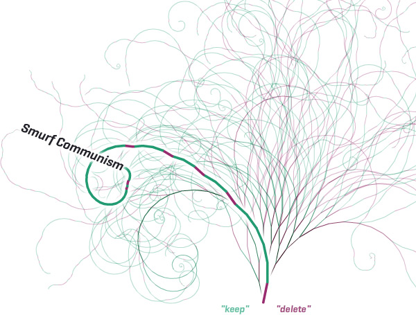 Comme des opinions antinomiques ont tendance à se compenser, les pages qui font l’objet de fortes controverses ou de discussions animées entre partisans ou adversaires d’un sujet donné dessinent des lignes plus ou moins droites. Tandis que les discussions plus consensuelles tracent des lignes en forme de spirales, qui convergent vers un accord.