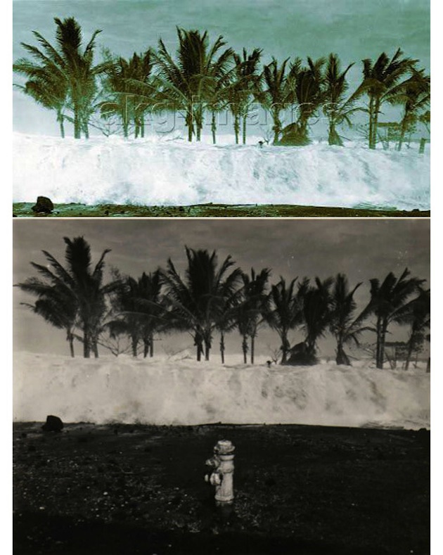 Cela m’a rappelé un cas sur lequel je suis tombé en préparant mon livre. Une agence d’images sérieuse proposait à la vente une photographie impressionnante censément prise à Haïti il y a deux ans, où l’on voyait des palmiers noyés par une vague géante [ci-dessous]. Jolie image, mais qui me posait un problème car il n’y a pas eu de tsunami en Haïti en 2010. Alors j’ai fait quelques recherches…