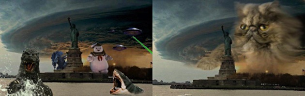 L’image ci-dessus à gauche cumule diverses menaces de cinéma : Godzilla, le requin géant des dents de la mer ou de Shark attack, des soucoupes volantes, le marshmallow man du film Ghostbusters. On retrouve aussi Godzilla derrière la statue de Neptune de Virginia Beach.